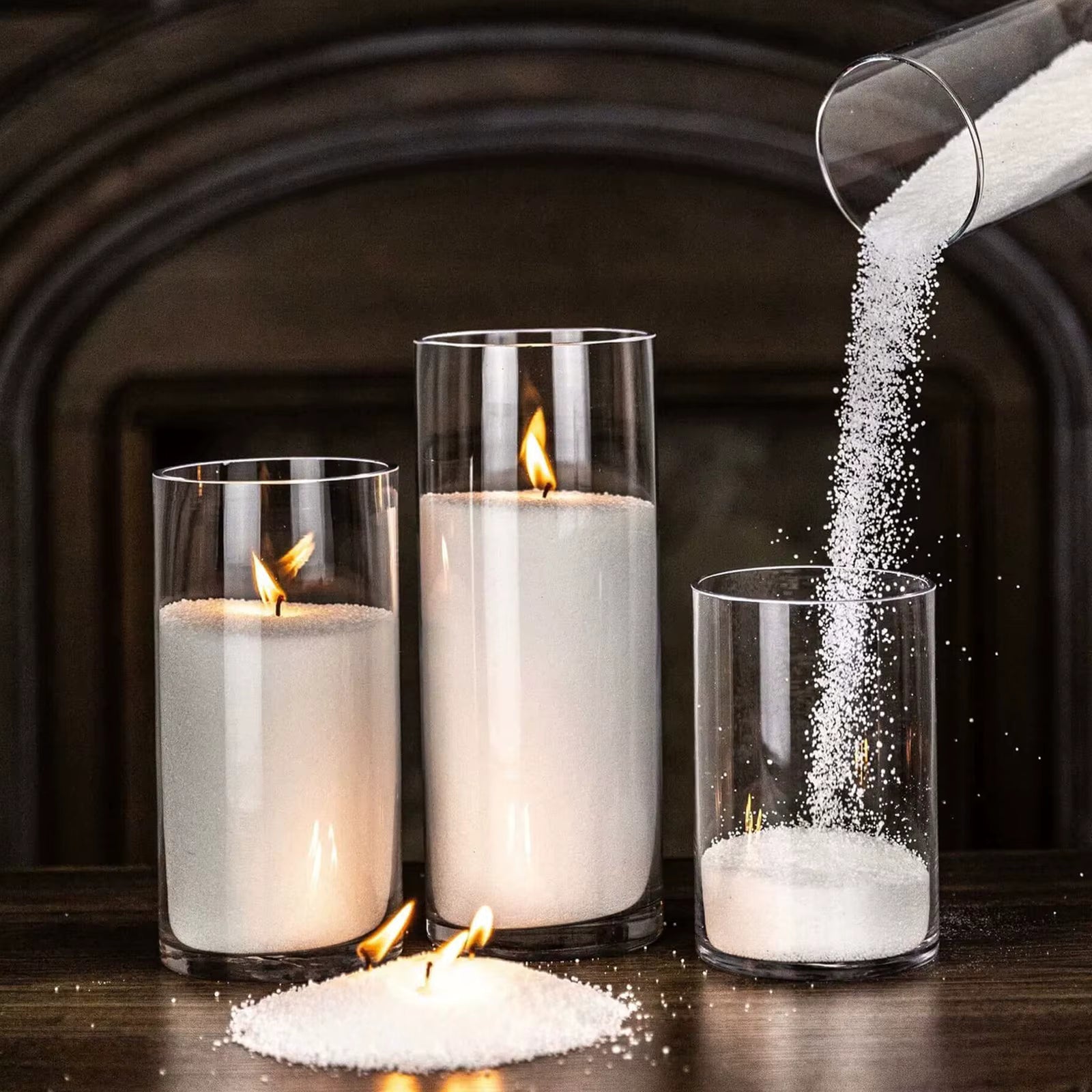 Sandkerzen bestehen aus einem speziellen Wachsgranulat (ähnlich Sand), das in eine Schale oder ein Gefäß gefüllt wird. Der Docht wird hineingesteckt und kann nach Bedarf neu platziert werden.